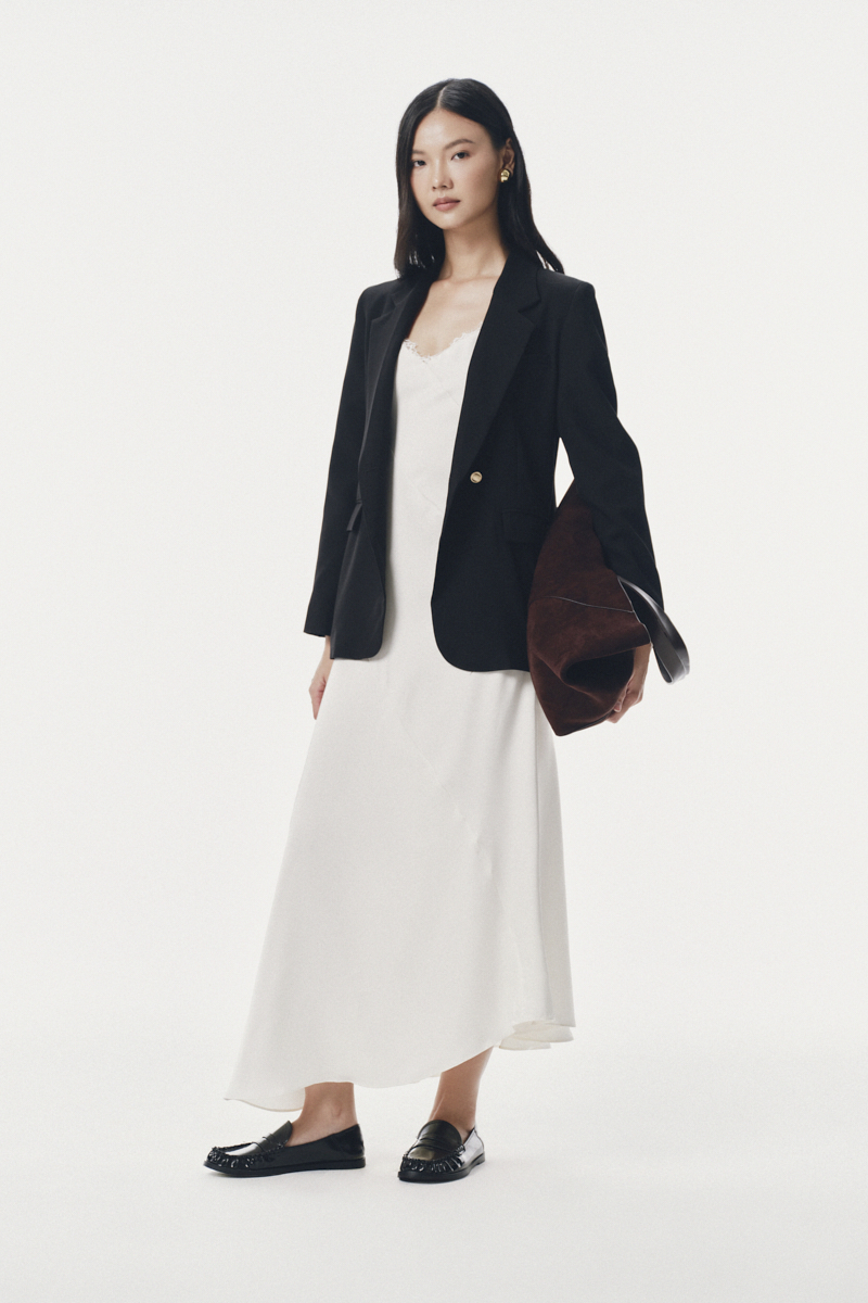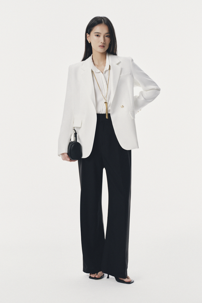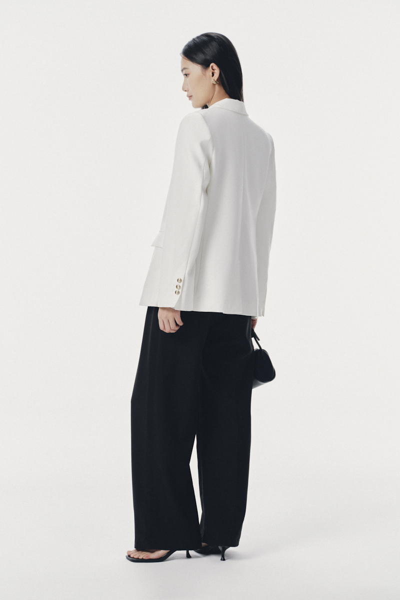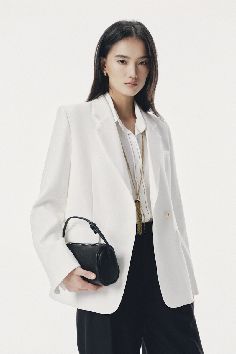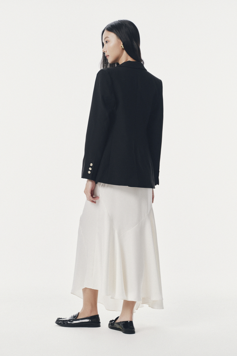 - Chi tiết: Áo blazer cổ 2 ve dáng suông có chiết ly nhẹ. Thiết kế vai vừa, có 1 khuy, tay dài có xẻ khuy sau. 2 nắp túi trang trí, ngực áo có cơi giả