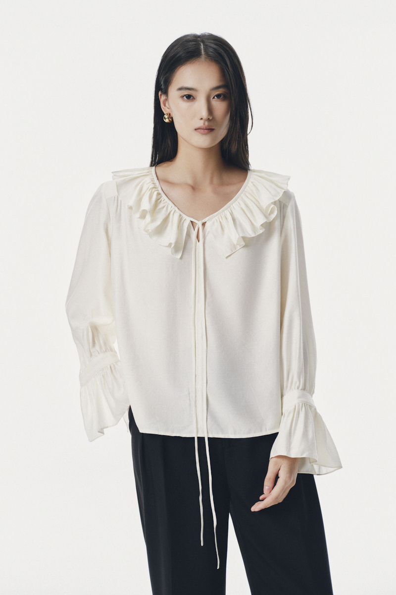 Áo kiểu dài tay cổ V xếp nếp bèo
