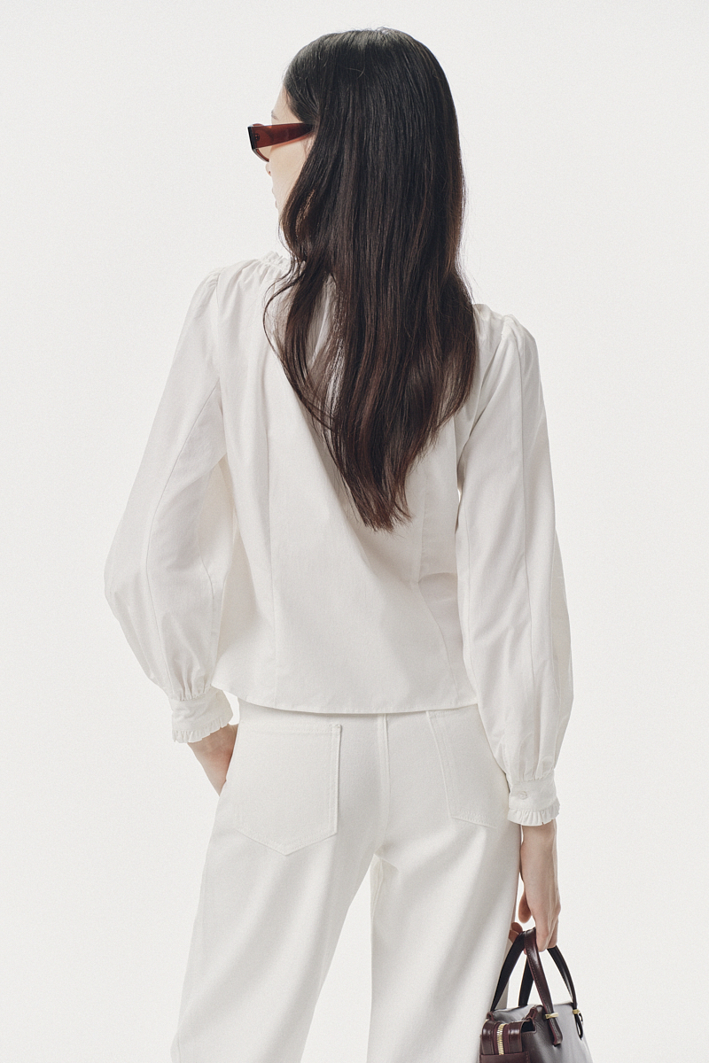 - Chi tiết: Áo cổ tròn rộng, nhún bèo quanh cổ. Thân áo xếp ly, eo nhẹ. nẹp cúc phía trước. Tay dài, nhún bồng vai & cửa tay có măng séc
