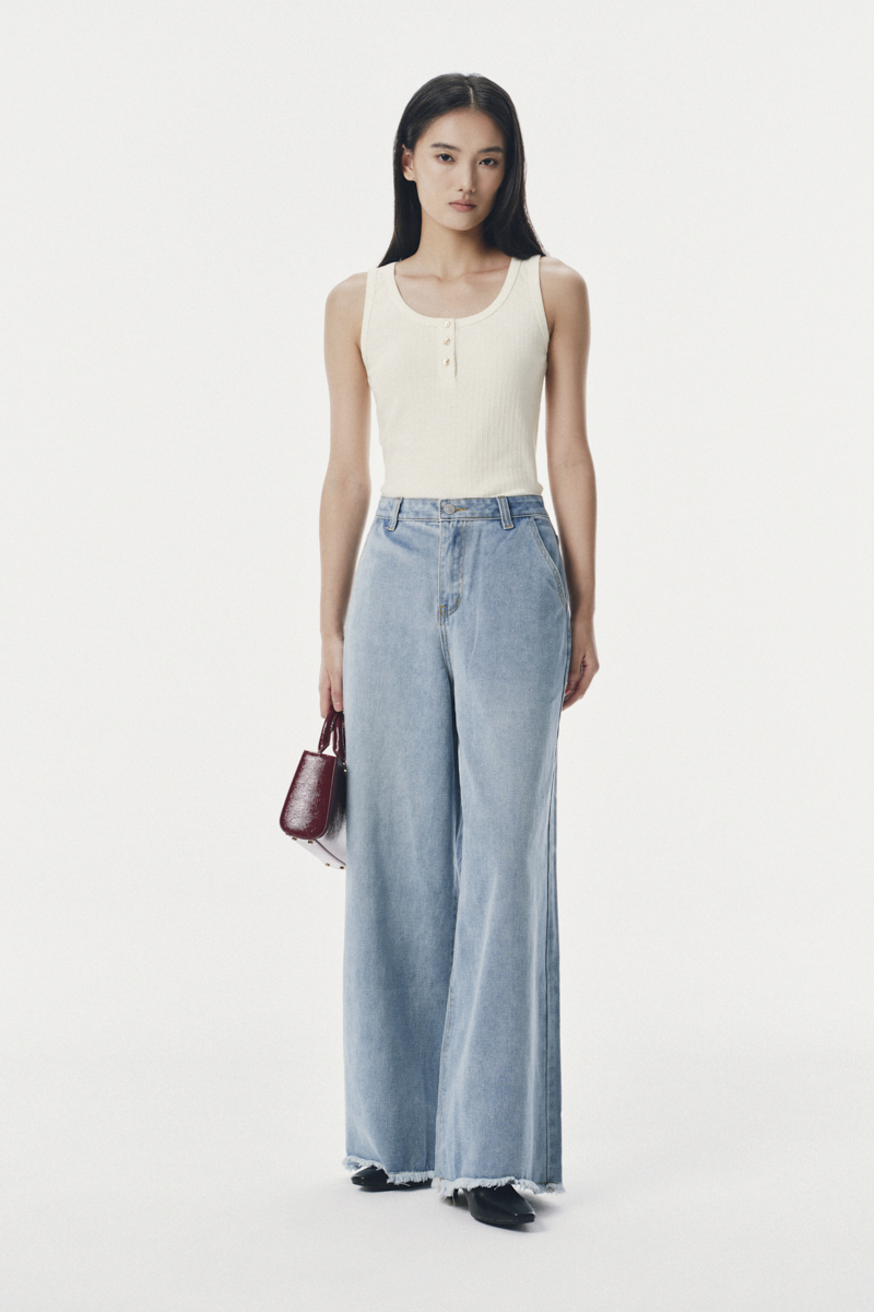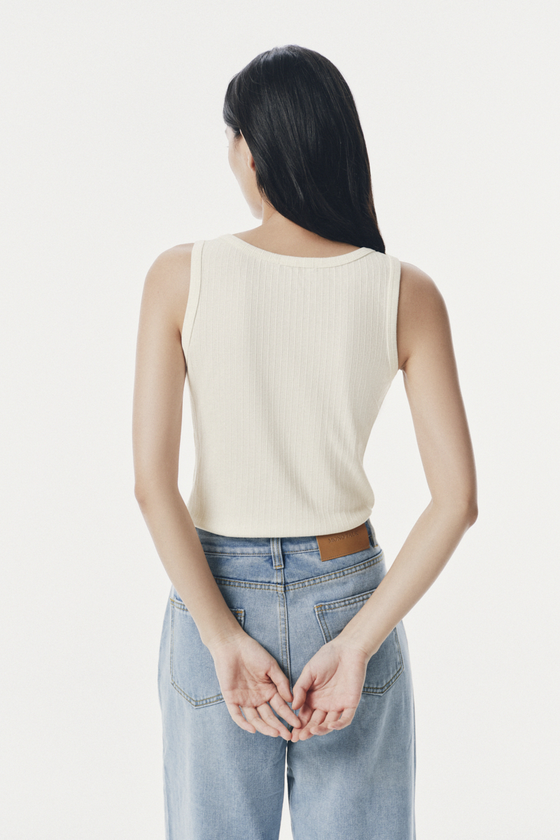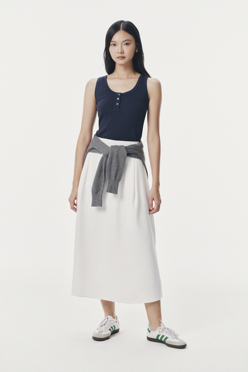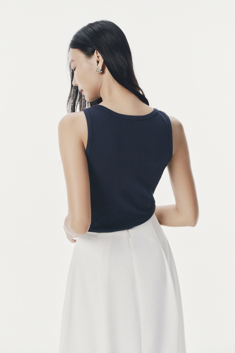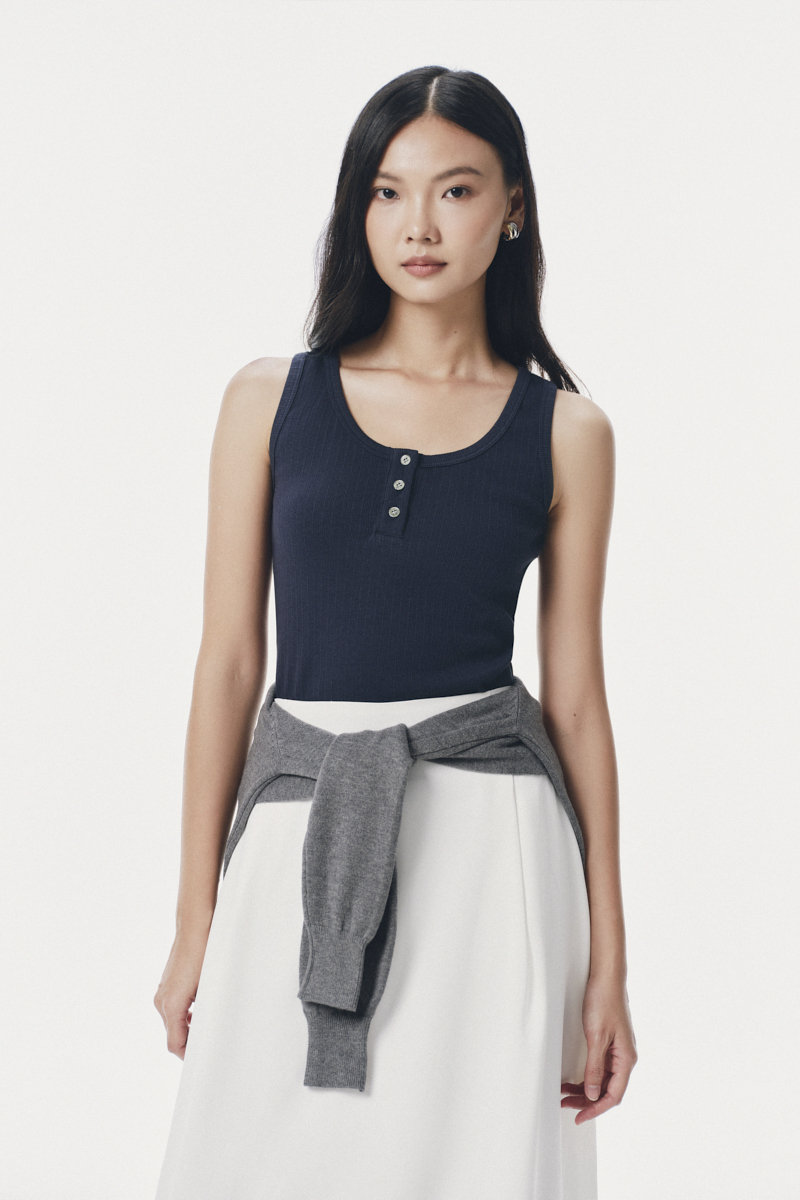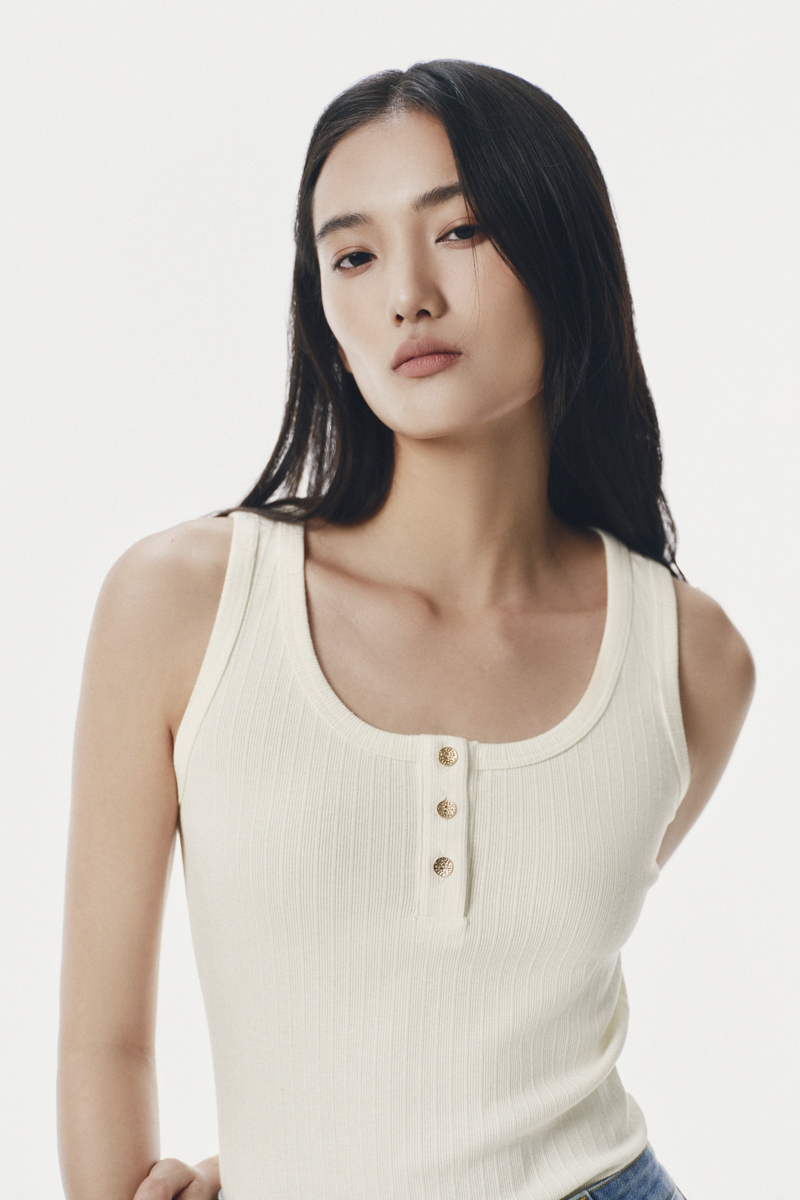 - Chi tiết: Áo thiết kế cổ U tròn, cài cúc ngực. Áo không tay, thân áo dài lửng qua cạp quần.