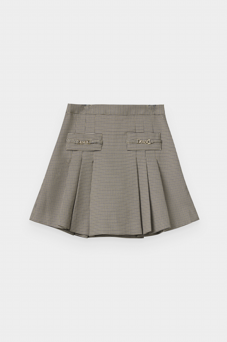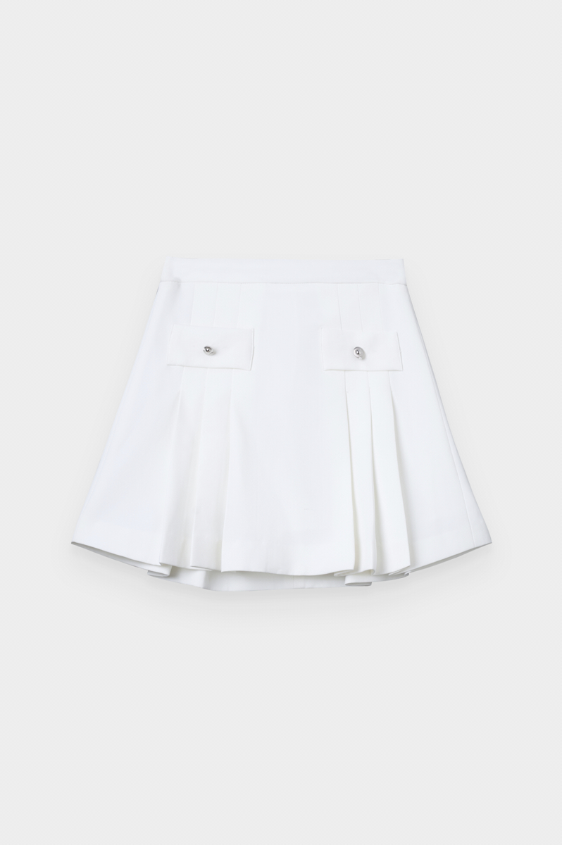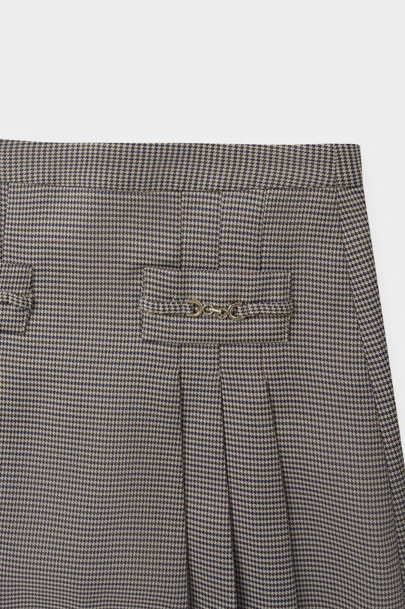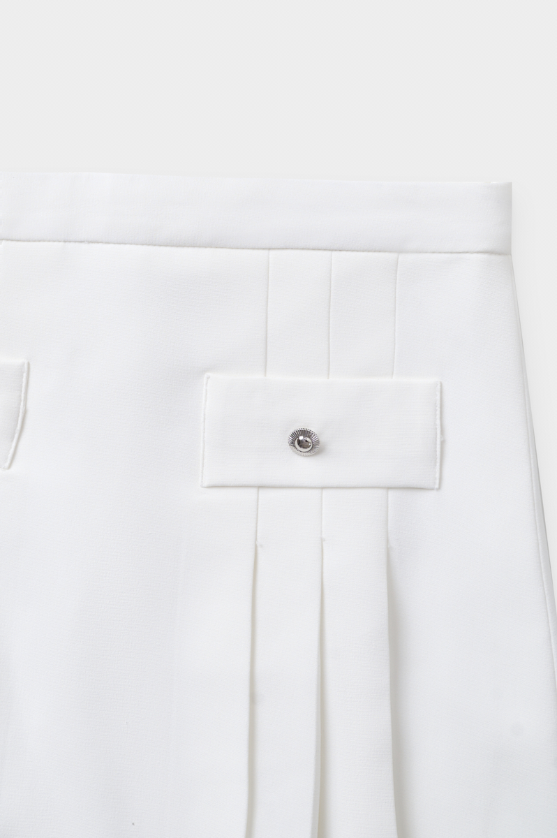 - Chi tiết: Thiết kế cạp cao, thân dưới xếp nếp 2 bên dáng A xòe. Phần thân 2 bên có chi tiết mặt đai trang trí.