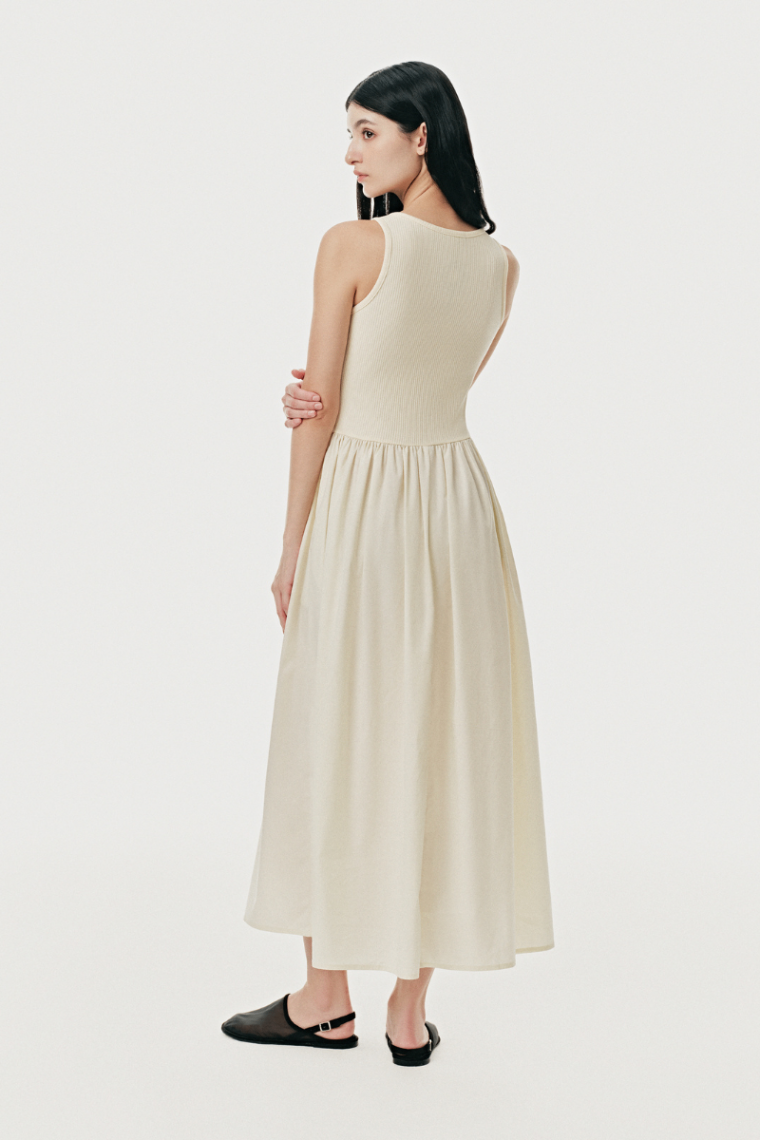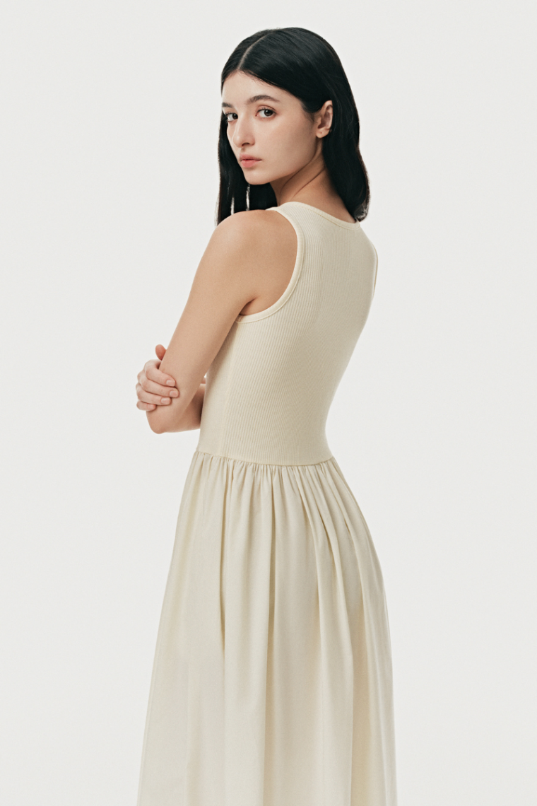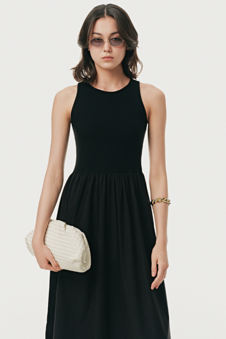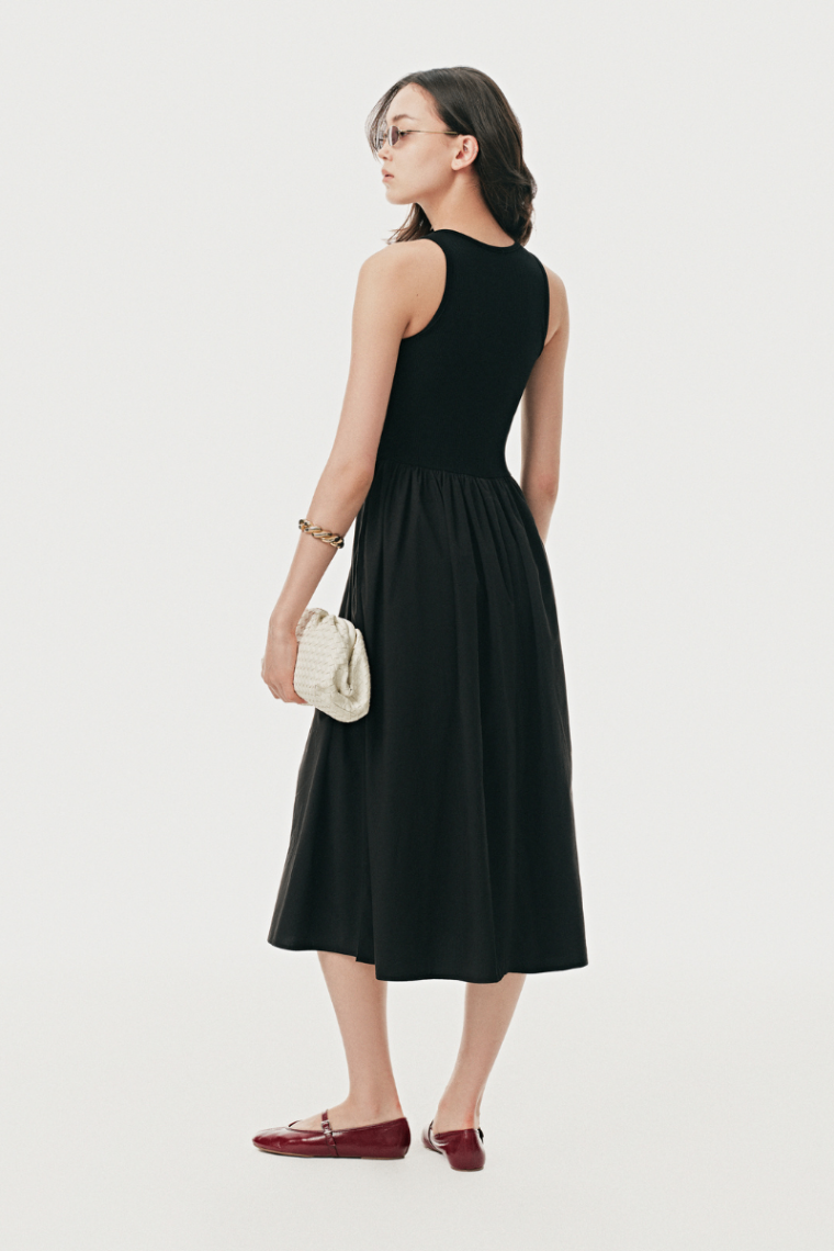 - Chi tiết: Váy không tay, thân trên ôm sát vải co giãn, cổ tròn, thân dưới nhún xòe, có túi sườn.