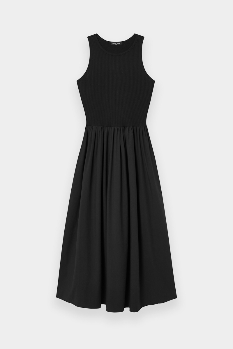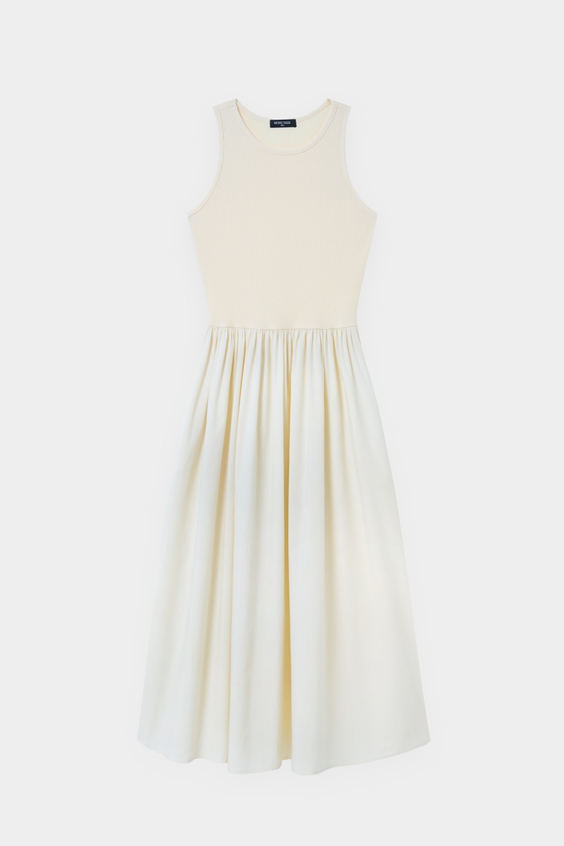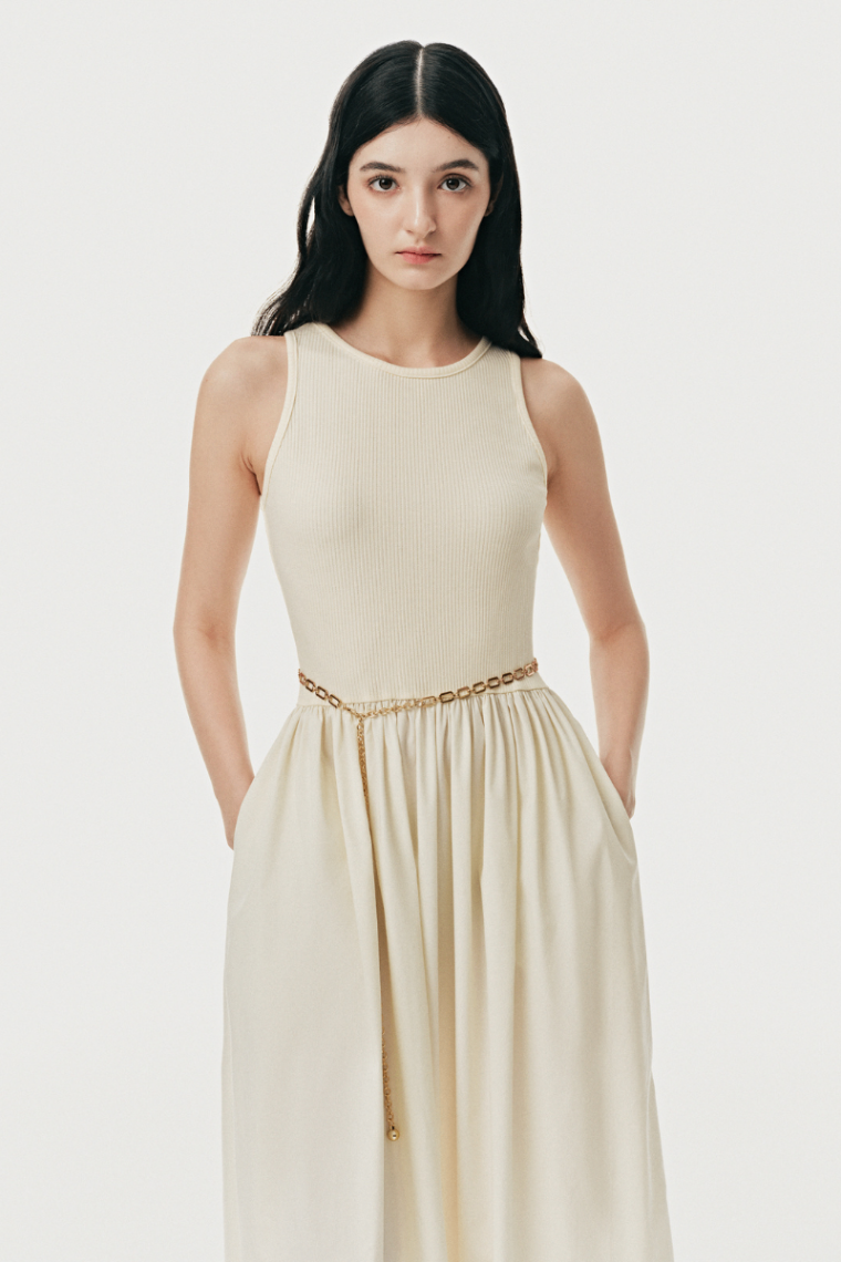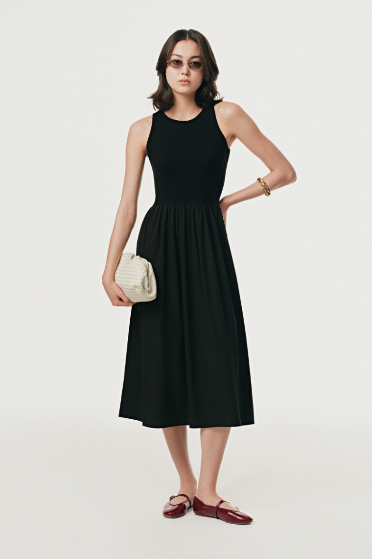 - Chi tiết: Váy không tay, thân trên ôm sát vải co giãn, cổ tròn, thân dưới nhún xòe, có túi sườn.